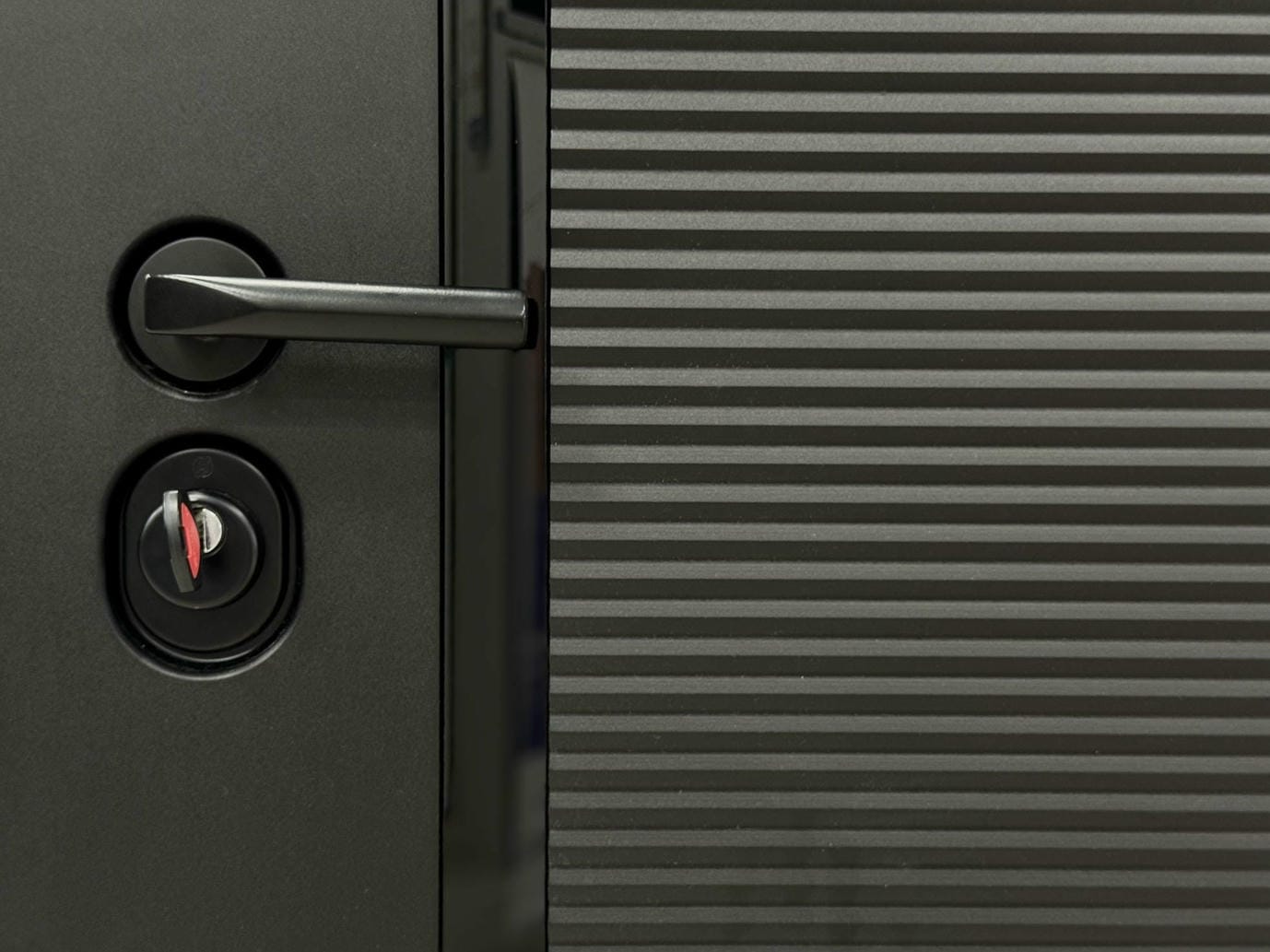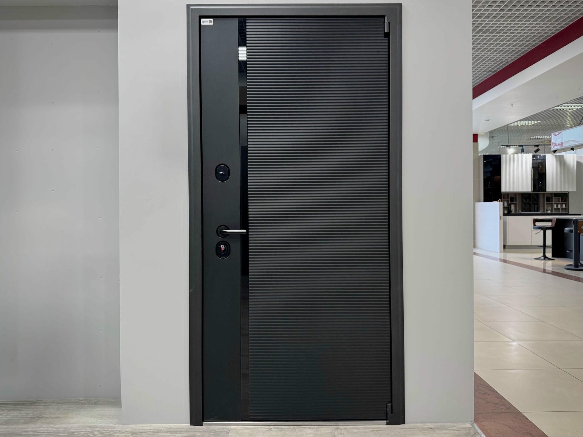 Премиальная входная дверь благородного черного цвета со стеклянной вставкой и итальянскими замками